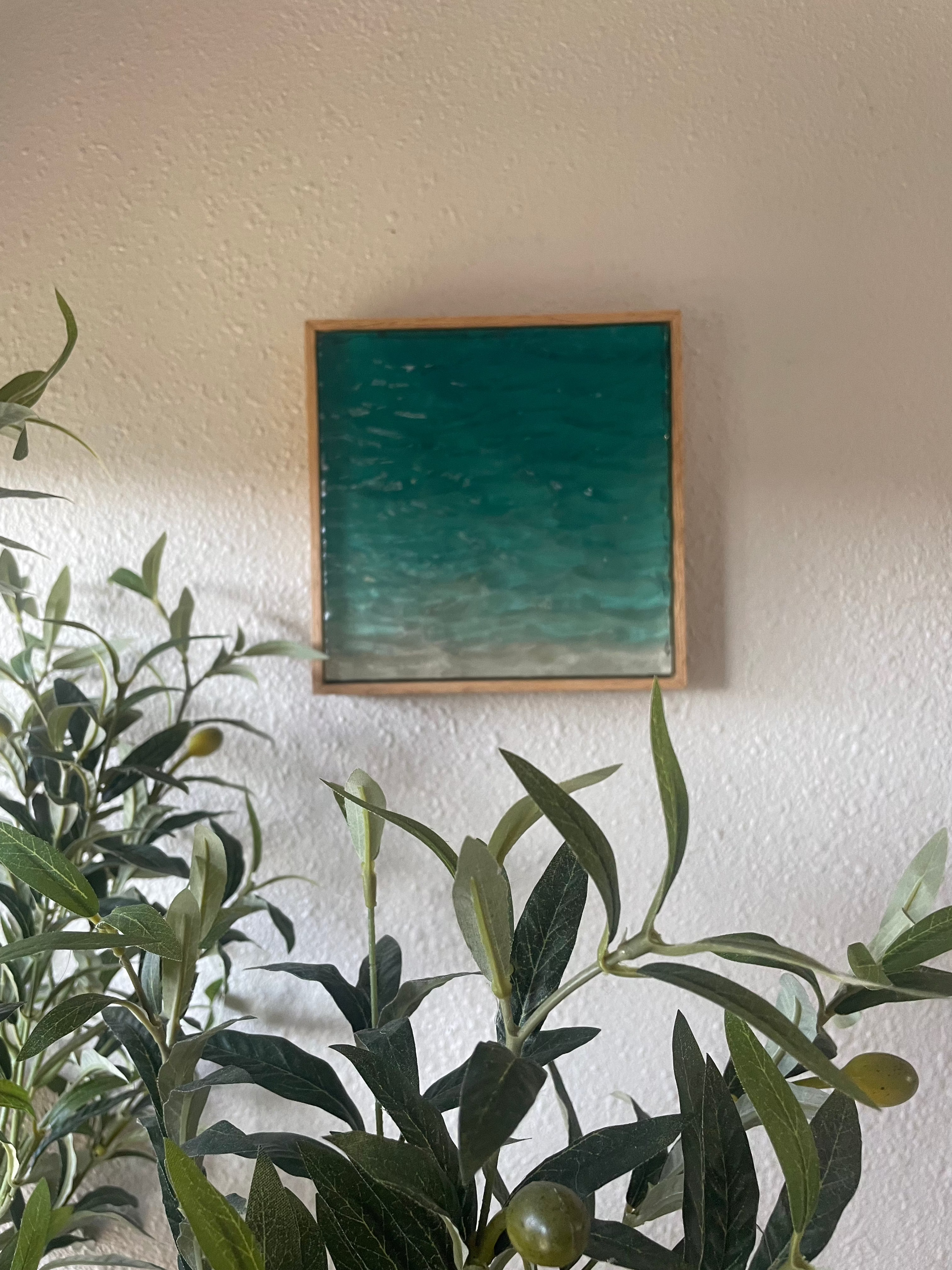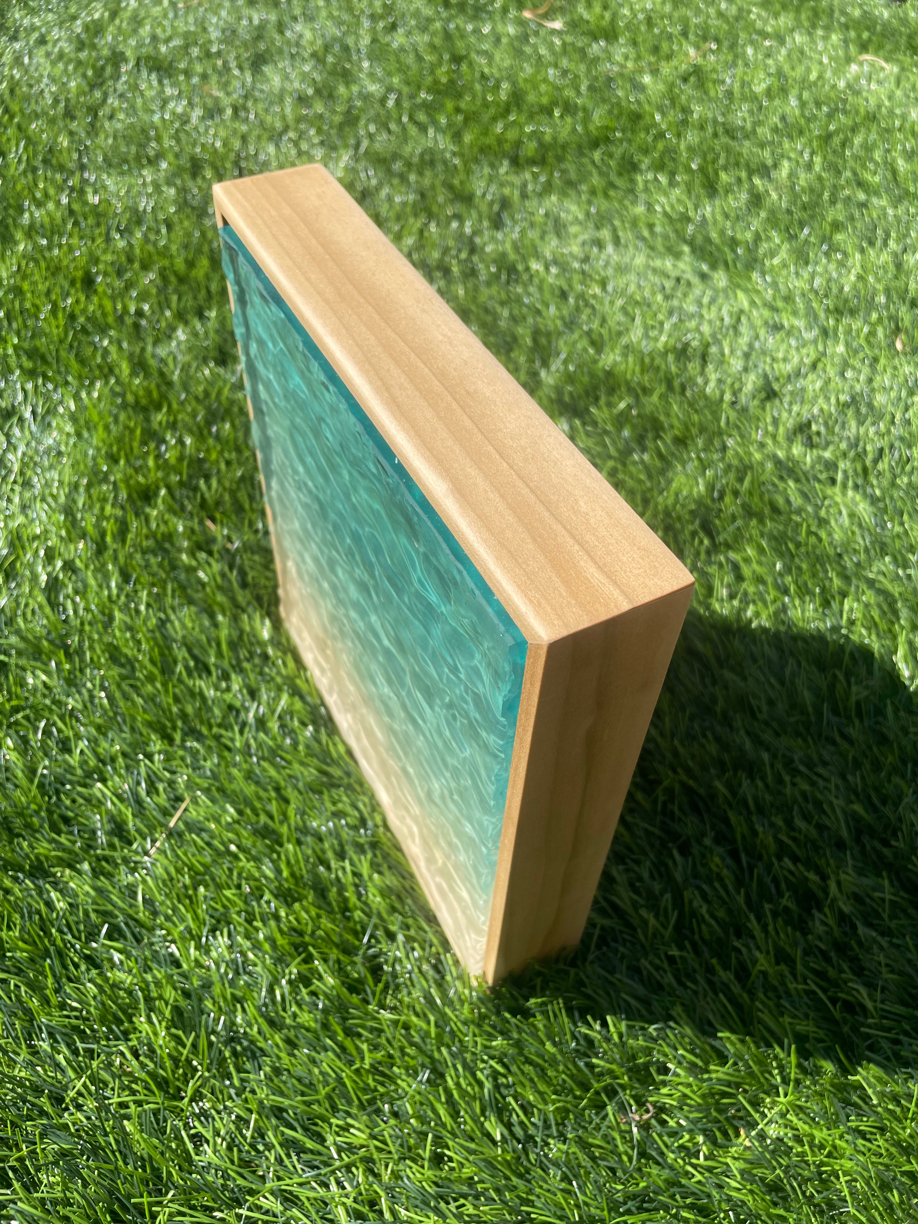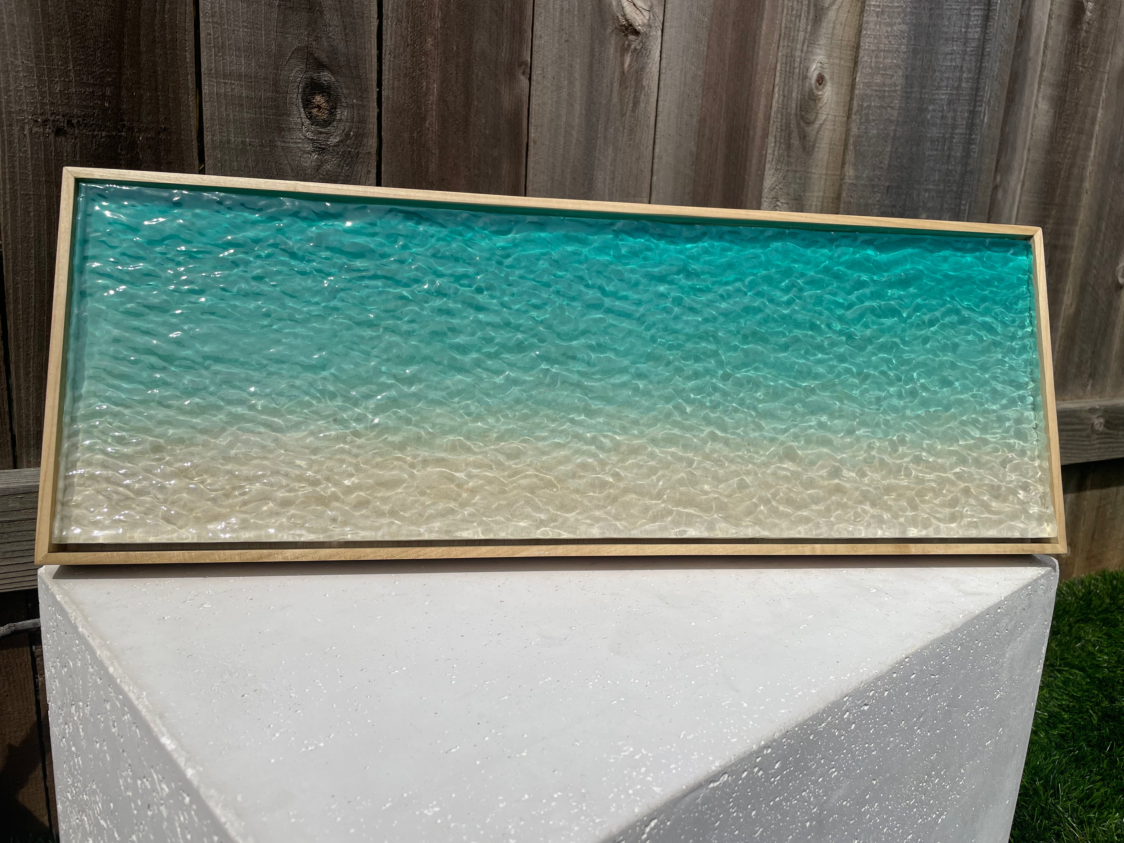 The "Live Water" collection is a stunning series of handcrafted resin art pieces, each meticulously sculpted in San Diego to capture the essence and beauty of the ocean. Every piece in this collection is unique, with layers of resin carefully poured and sculpted by hand to create the mesmerizing illusion of moving, sunlit waves. From vibrant turquoise hues blending into soft, sandy tones, each artwork feels like a window into a serene tropical shoreline, frozen in time yet full of life. Framed in handcrafted natural wood, these pieces exude a coastal charm that invites tranquility and wonder into any space. The "Live Water" collection offers a slice of paradise for your home, each piece a testament to the timeless allure of the sea.