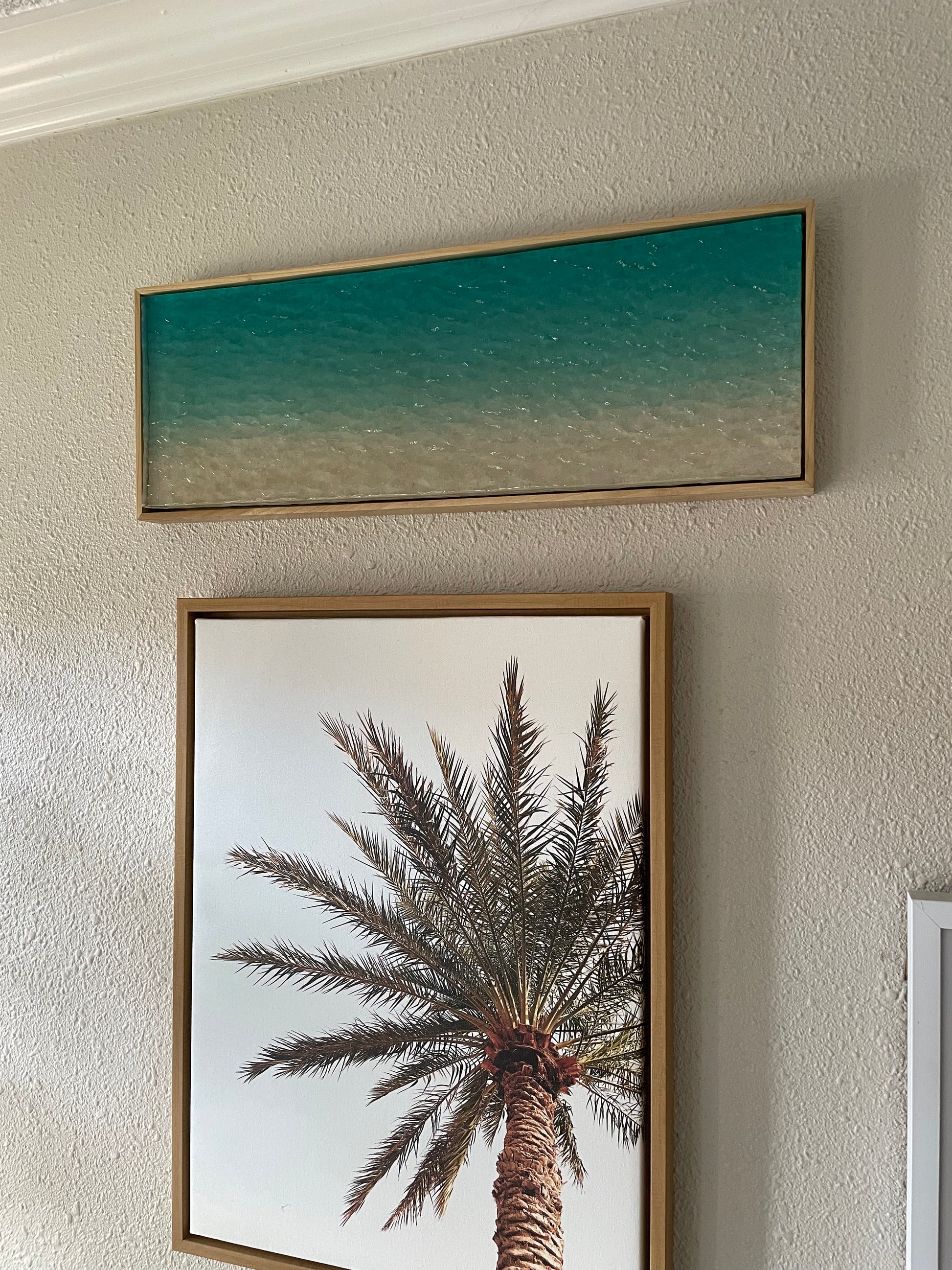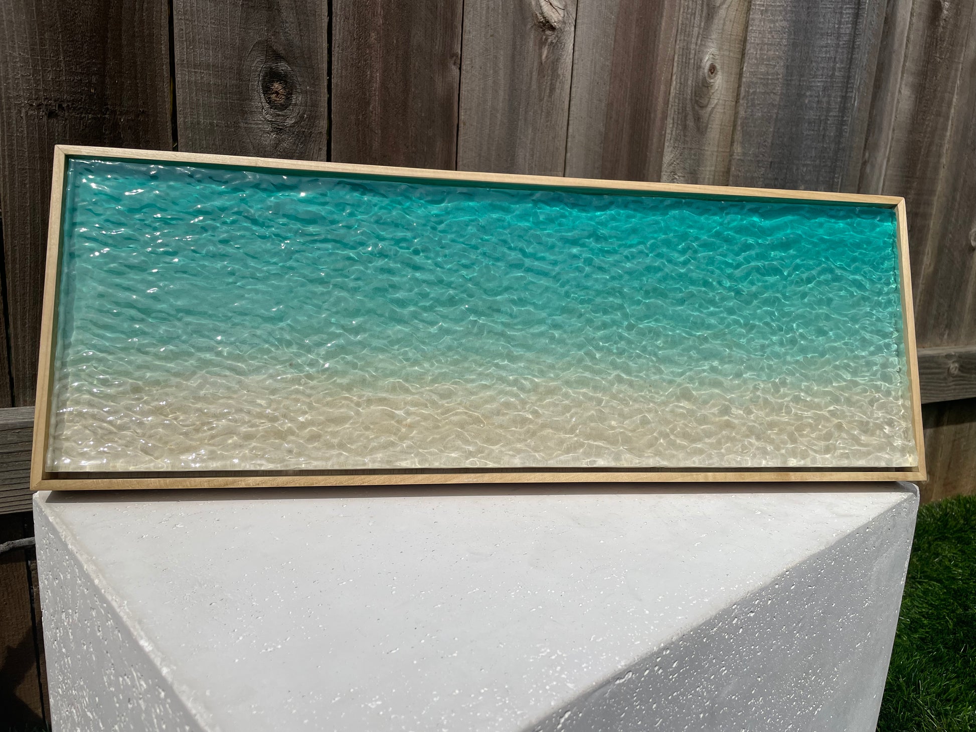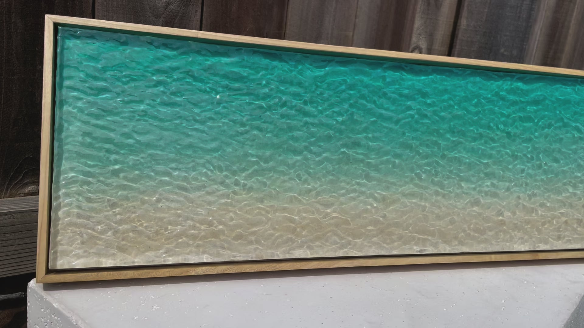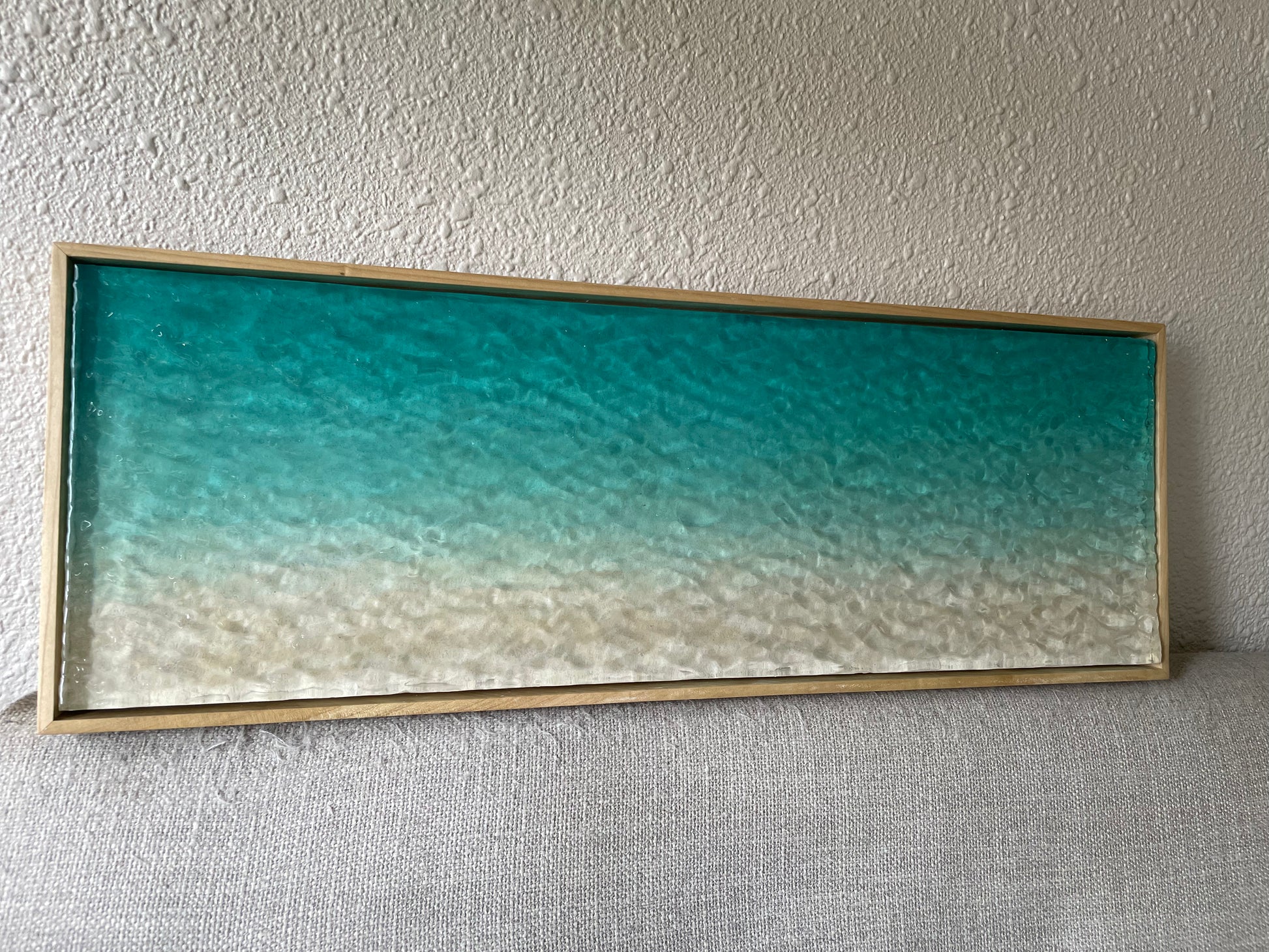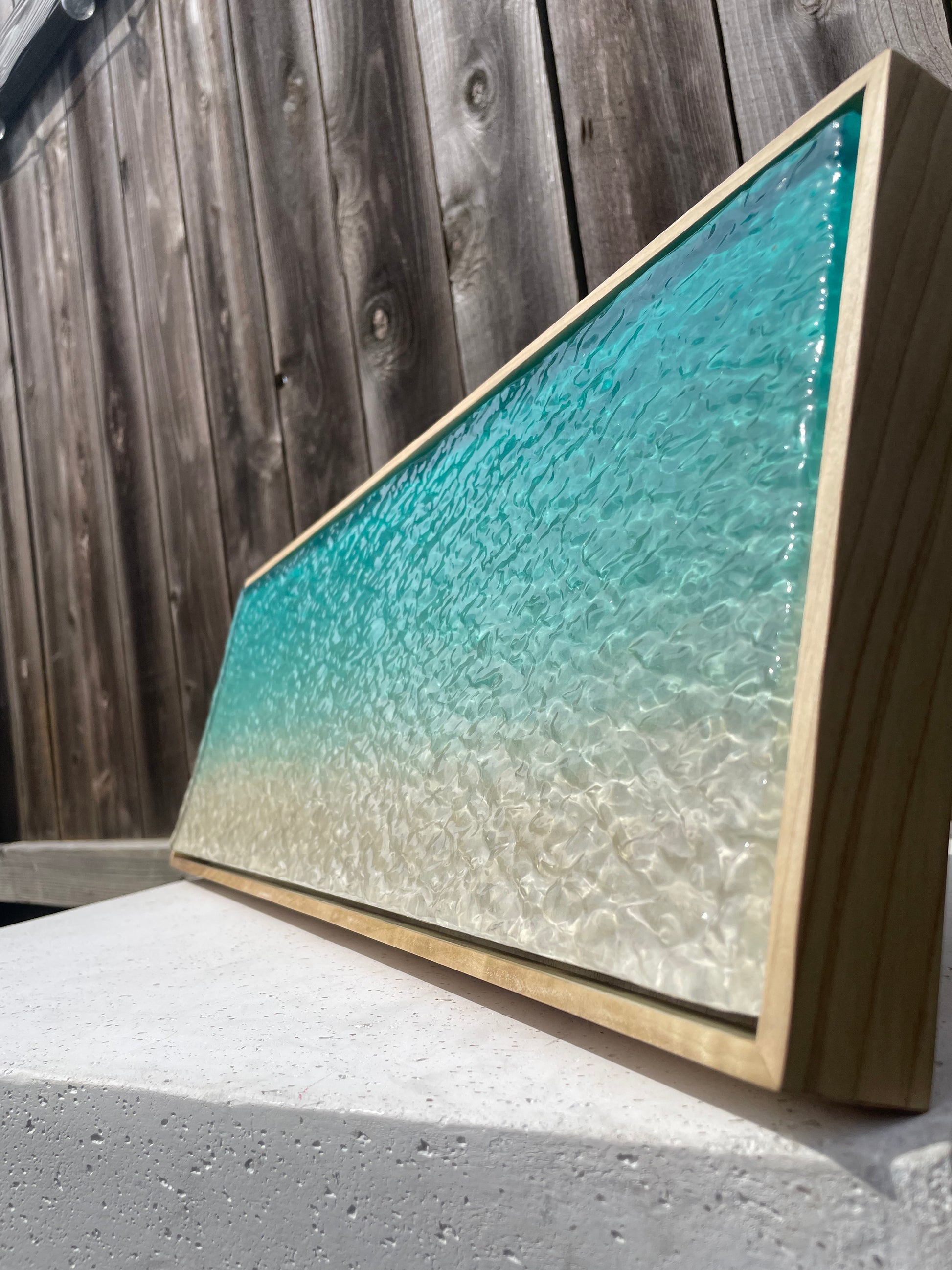 This multimedia layered piece is a 100% hand-carved, one-of-a-kind work of art, featuring a rippled resin surface that transitions from a rich turquoise into a soft sandy hue—perfectly capturing the look of clear, shallow ocean waters. Set in a simple hand-made, poplar wood frame, its three-dimensional texture and high-gloss finish create a realistic sense of gentle shoreline reflecting the sunlight. The artwork is also UV resistant, ensuring its vibrant colors and glossy finish remain intact over time, making it both a stunning and durable statement piece for any space.